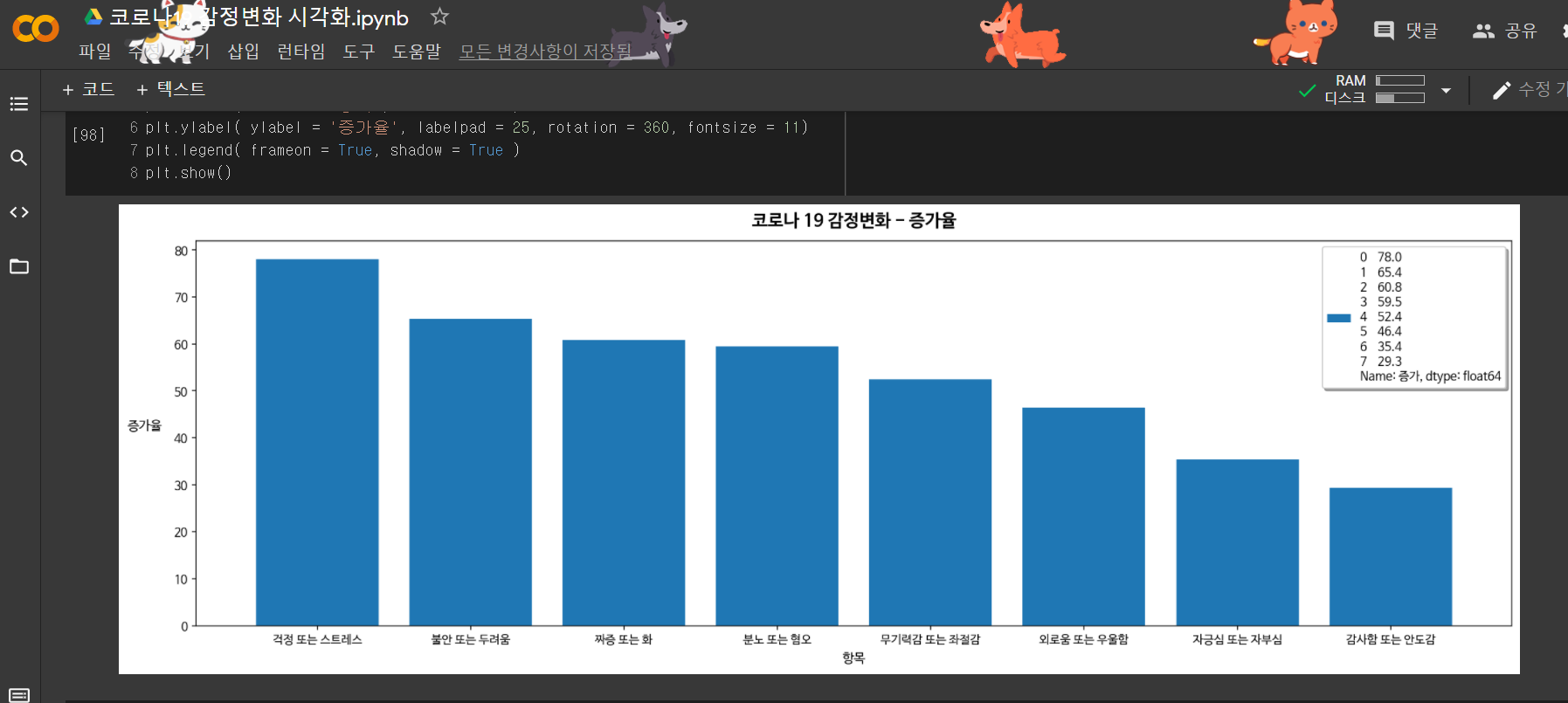 Python의 matplotlib의 기본 폰트가 한글을 지원하지 않아서 한글 폰트로 설정을 해주어야 합니다. 아나콘다에서는 그렇게 한글을 지원하도록 설정만 하면 문제가 없습니다. 그런데 구글의 Colab에서