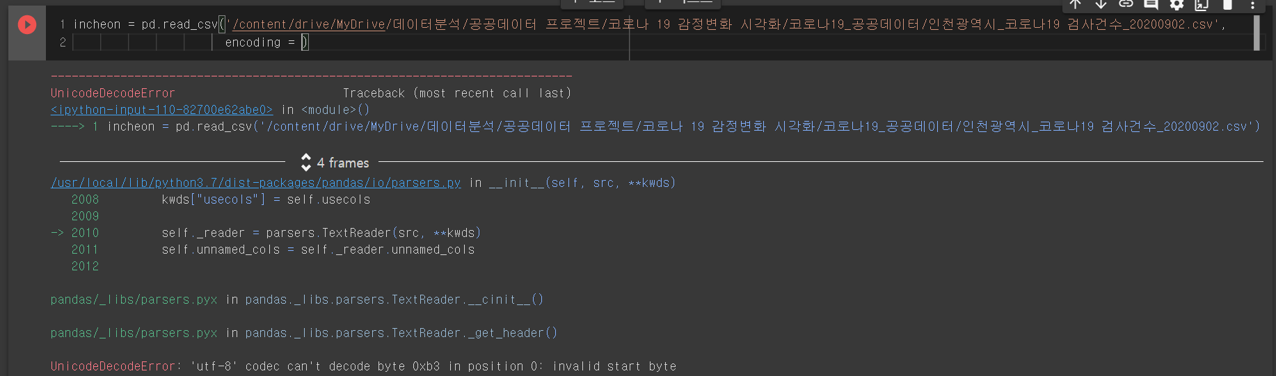- Pandas 라이브러리를 통해서 csv 파일을 임포트하는 경우(pd.read_csv('파일경로') 에 아래와 같은 에러가 발생하는 경우가 있다.
